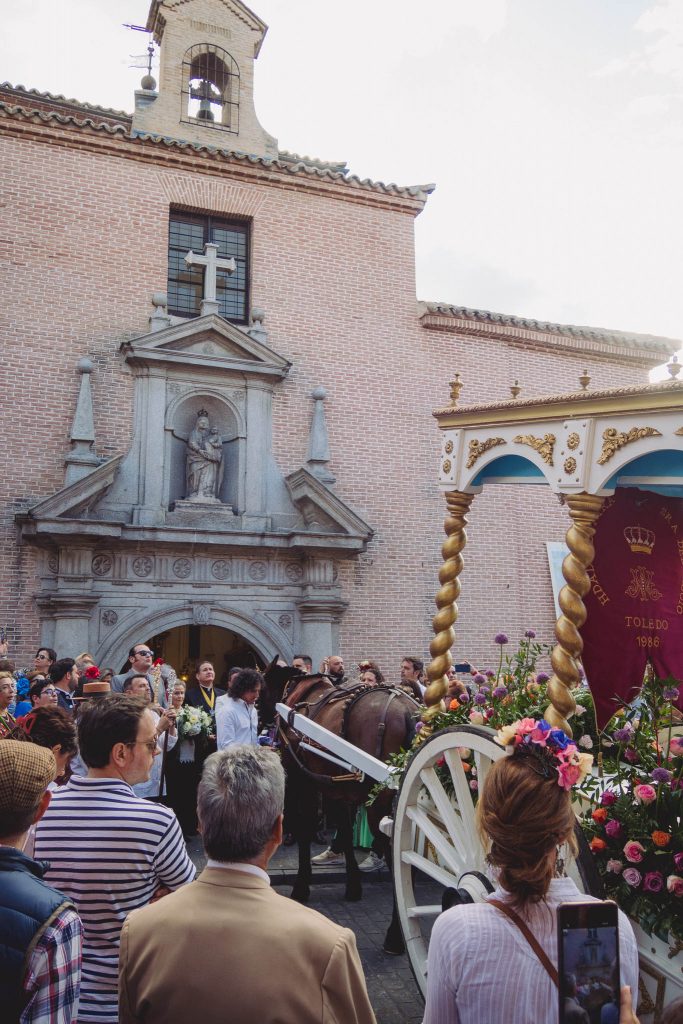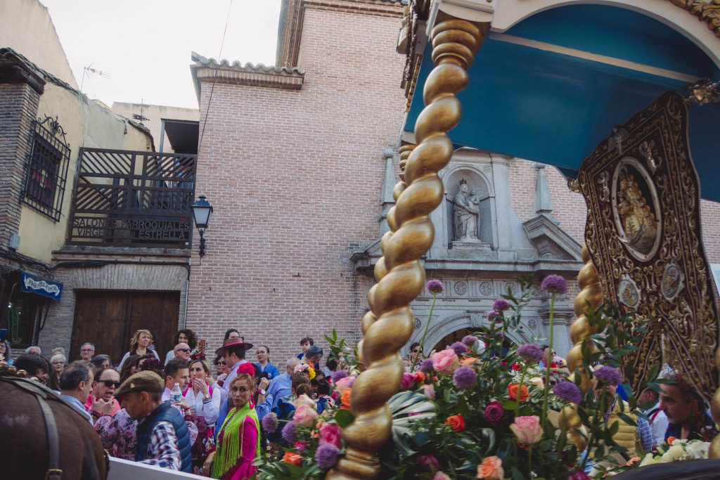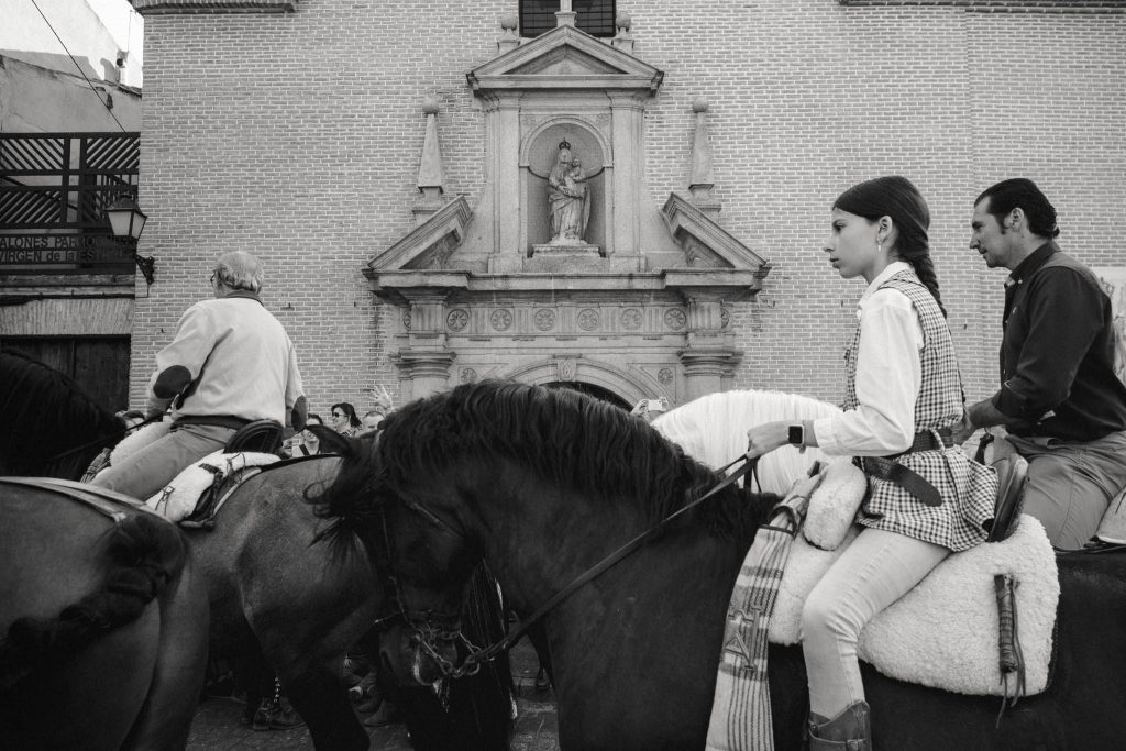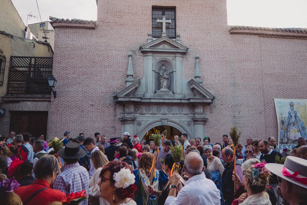 Miles de romeros, bajo el repique de la campana de la Ermita comenzaron a abarrotar el Real del Arrabal acompañando al Simpecado, que sobre su carreta, al llegar a la altura de la puerta de la Capilla, que permanecía abierta de para en par, se giró para enfrentar a la Blanca Paloma y a la Reina del Arrabal.