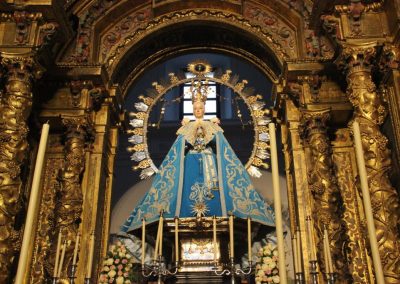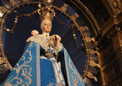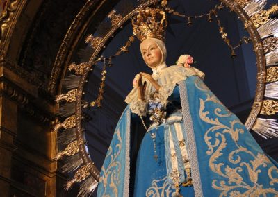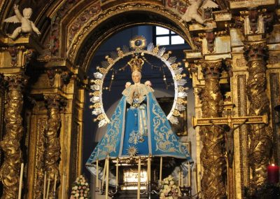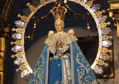 La Santísima Virgen María, como mejor modelo del Adviento se presenta hoy, víspera de la Solemnidad de la Inmaculada Concepción, ataviada con el clásico terno de terciopelo azul y bordado en plata.