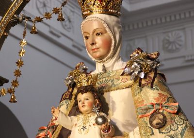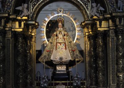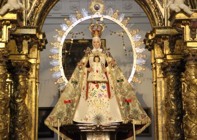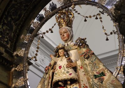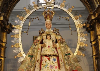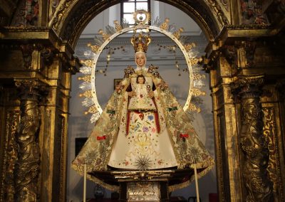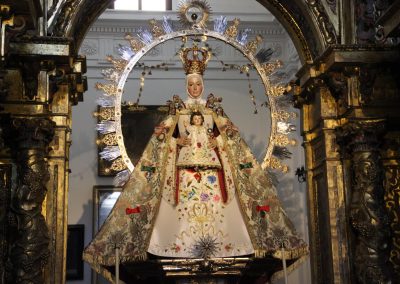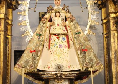Luce Nuestra Señora el manto de seda italiana, que portara para su traslado a la Catedral Primada con motivo de la Coronación Canónica y además, la saya “del paraíso”, realizada por Sebastián Marchante, y conocida así por su diseño, asimétrico, cuyo motivo central es un gran ramo de flores bordado a realce en seda de colores con una lazada bordada en seda natural de tonalidad rosa y oro con la técnica de la hojilla en plano. Destaca la ejecución de la obra en cuanto a técnica y diseño, magistrales. Entre los elementos ornamentales adquieren especial protagonismo las rosas, azucenas, lirios y jazmines, que simbolizan, comentaban, las virtudes marianas. Además de pequeños animales, como un pájaro y mariposas, que simbolizan la culminación de la Creación. La misma fue estrenada el pasado año para su estación procesional tras el Novenario celebrado en su honor.