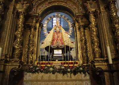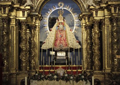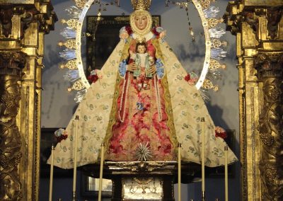 Con motivo de la celebración de la Navidad, como es tradicional en la hermandad de la Estrella, Nuestra Señora ha sido ataviada de manera especial para celebrar la llegada de este tiempo litúrgico. Luce la Santísima Virgen saya carmesí confeccionada a partir de una pieza de seda expolinada de finales del XVIII, y manto color marfil de similares características, rematado este último con galón de oro de Milán enriquecido con flores bordadas en seda. El rostrillo, también restaurado, es una preciosa pieza bordada en oro con pequeños granos de aljofar natural. Luce además un elegante juego de puños del siglo XIX donado por un hermano.