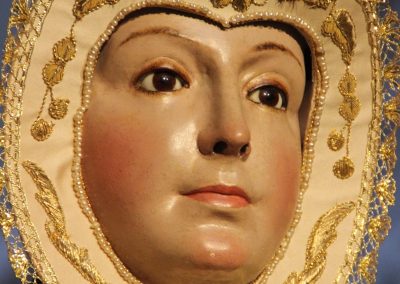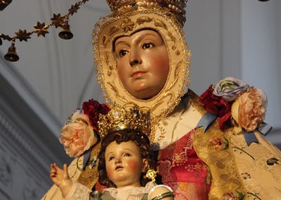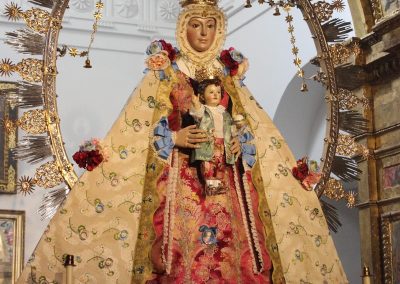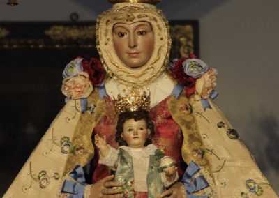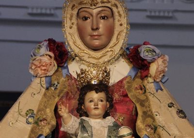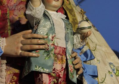 Ambas imágenes lucen las preseas de la Coronación, labradas por Fernando Marmolejo, y El Niño, porta en su mano izquierda un orbe de marfil rematado con cruz de oro guarnecida de esmeraldas.
