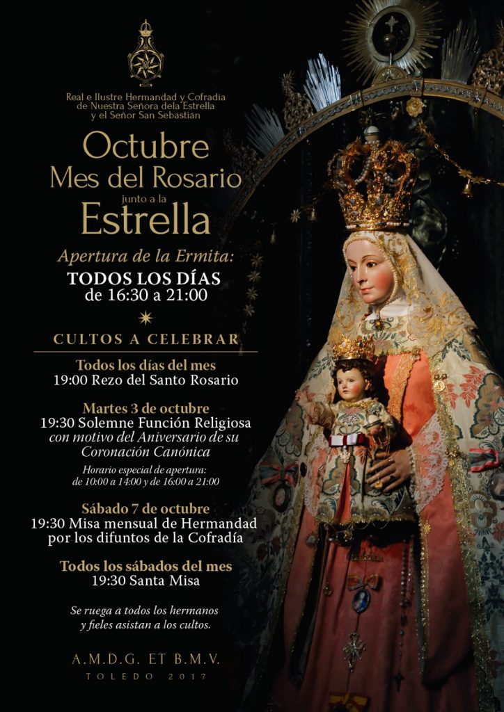 La Hermandad celebrará de nuevo durante octubre importantes cultos en torno a la Virgen de la Estrella, con motivo de la celebración del Mes del Rosario y del Aniversario de la Coronación Canónica de Nuestra Señora. Para ello, la Ermita abrirá sus puertas de manera extraordinaria todos los días del mes de 16:30 a 21:00, horario que se verá ampliado algunos días.