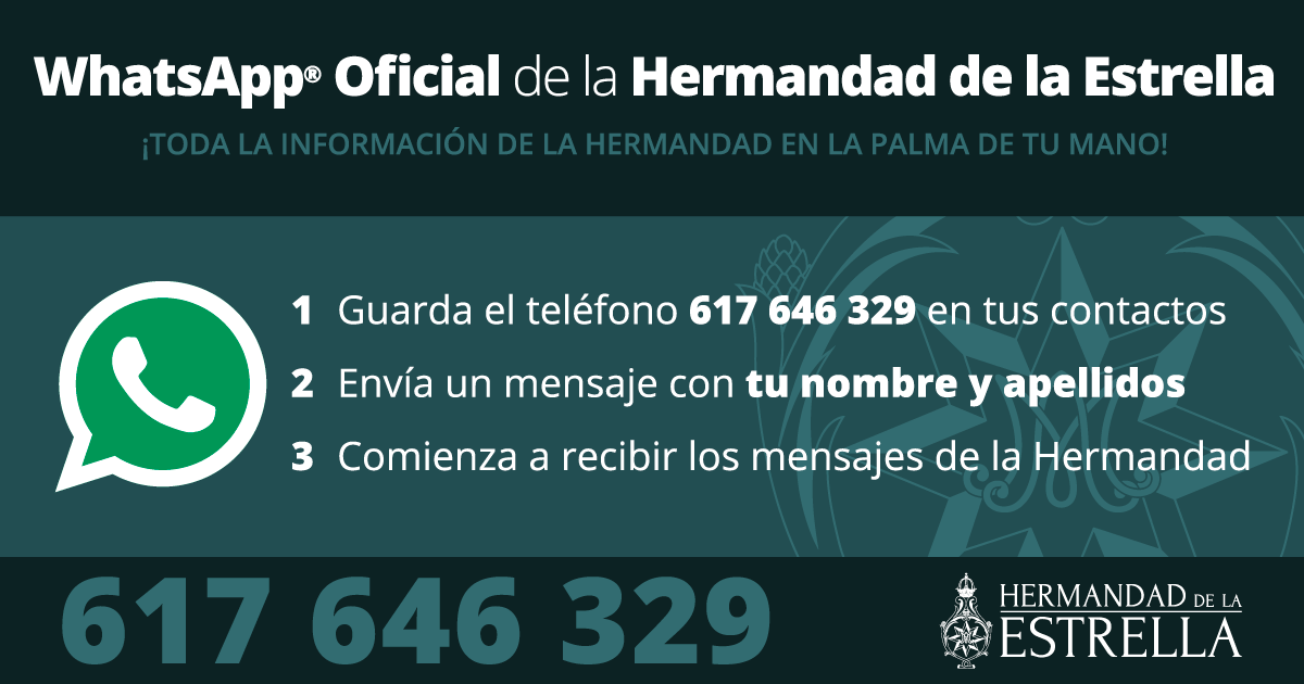 ¡La Hermandad de la Estrella llega a WhatsApp! La popular aplicación de mensajería instantánea WhatsApp, utilizada por millones de personas cada día, es desde hoy, el nuevo canal de comunicación entre la Hermandad y los hermanos y devotos. Se trata de un nuevo medio por el que todos aquellos que estén interesados recibirán en su movil la información actualizada de lo que acontece en torno a nuestra Cofradía.
